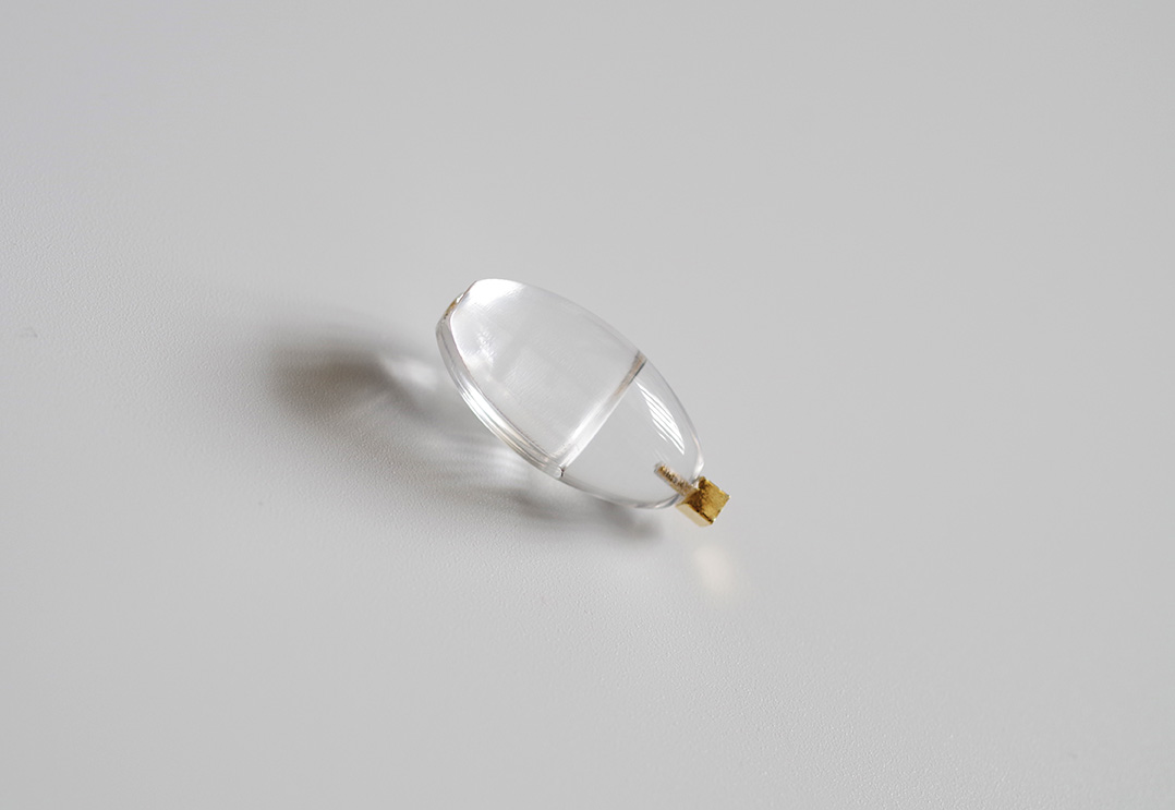 旋盤という機械を使って楕円状の回転体を削り出し、耳を挟む溝を付けました。その後ピカピカに磨くことでこのような水のしずくのようなぷっくり感が出ます。