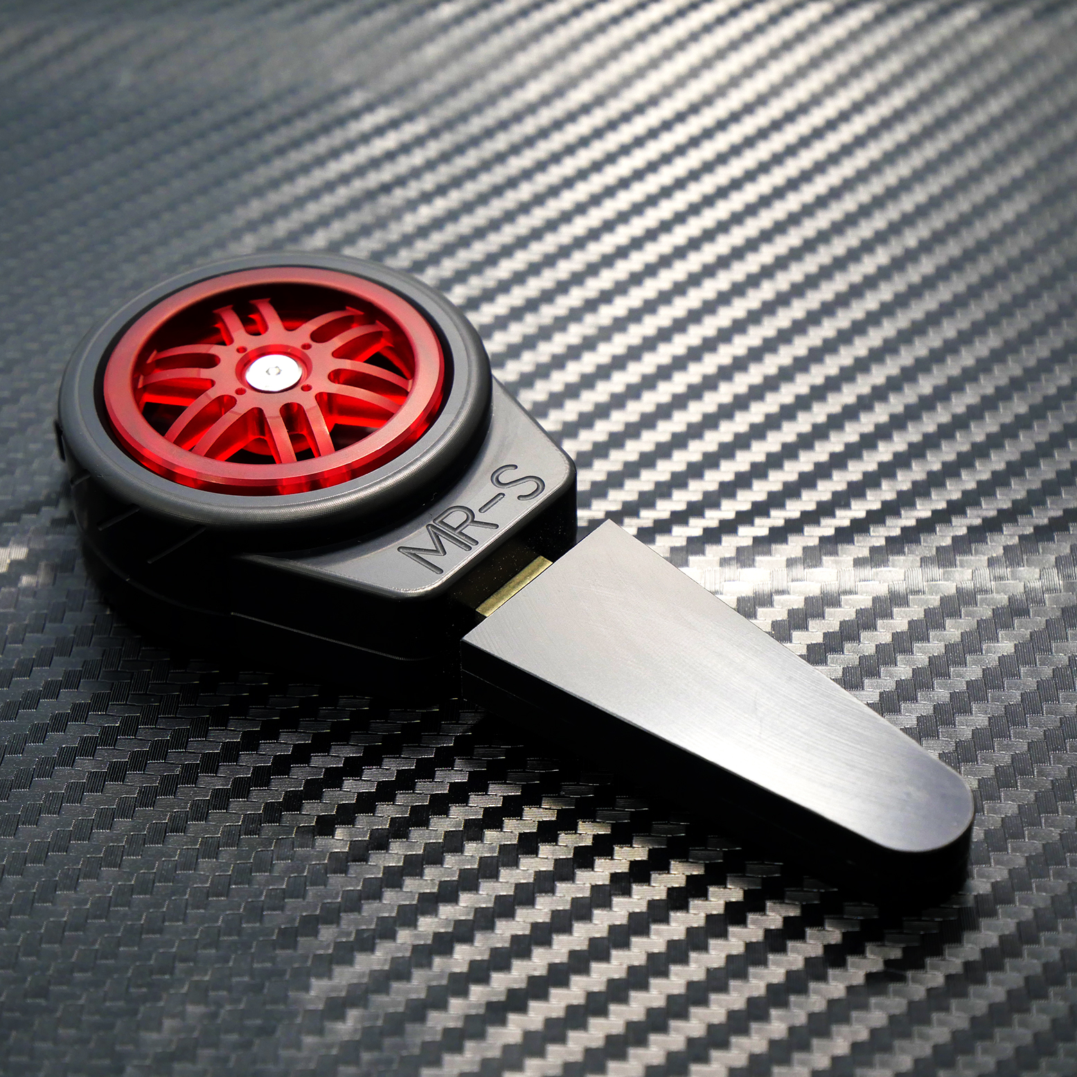 こだわりポイント④:車種名の刻印実際のホイールを元に、切削加工ができる範囲でのアレンジを加えて再現しました。本体の素材はABSという樹脂材料を使っています。ホイールはアルミやアクリルなど、好みの材質での製作も可能です。このホイール部分は回すことができるので疾走感も感じられます。そして全体をタイヤの形状にすることで、より愛着を感じられるキーとなりました。